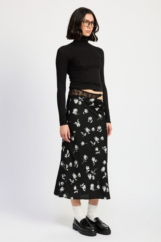 Features: Midi Skirt, Floral Print, Mix Media, Satin Fabric, Midi Length, Lace Details, Cutout Waist