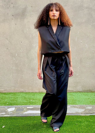 Power dressing done your way. This blazer features a V-neckline, relaxed, cropped silhouette, padded shoulders, double breasted closures, and notched lapels.