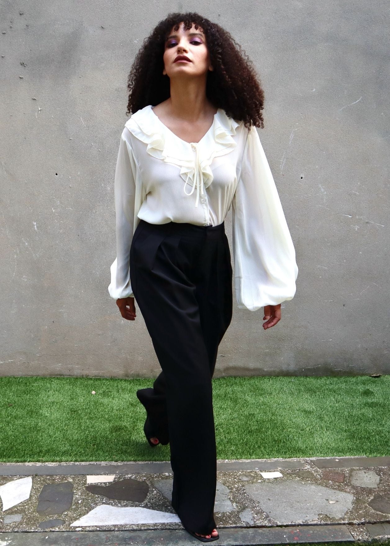 We're ruffle of damn good ideas. This blouse features a relaxed silhouette, balloon sleeves, elasticized cuffs, V neckline, tiered, ruffle detailing, and button down closure at front. Rad with mom shorts and biker boots. Model is 5'9" and wears a US size 6/UK size 10.