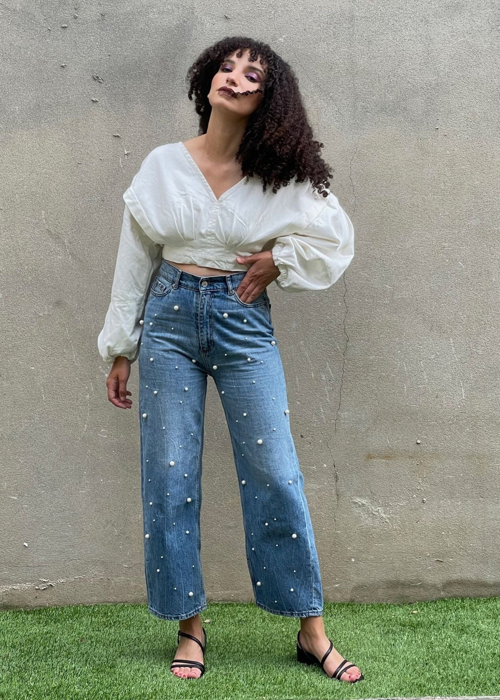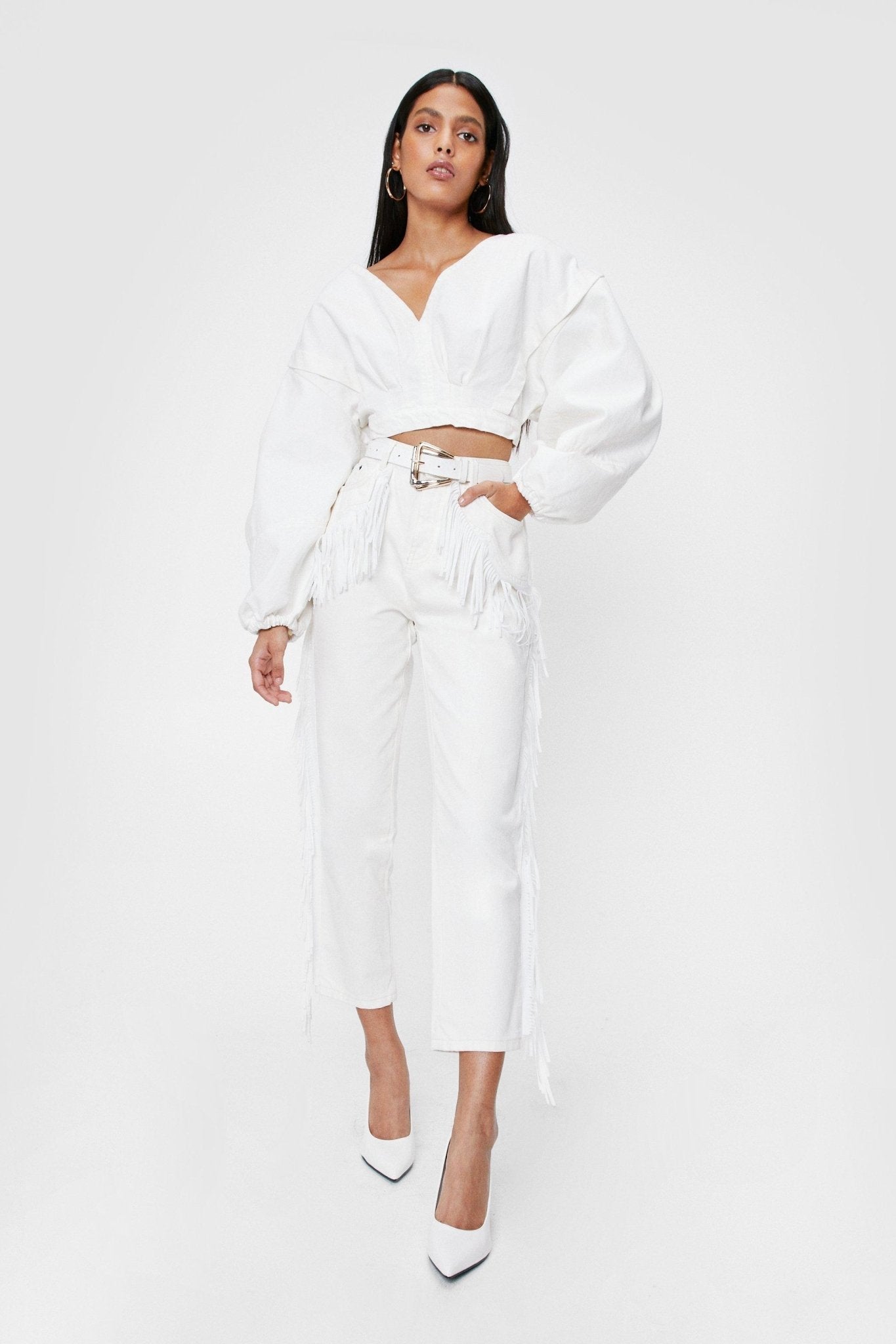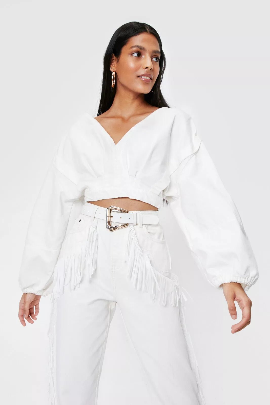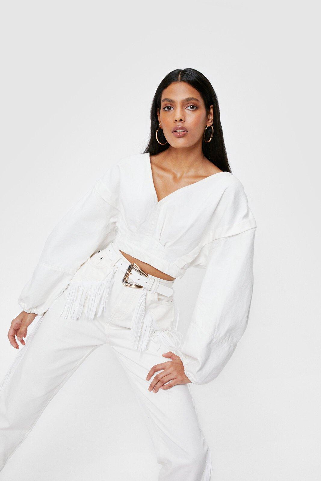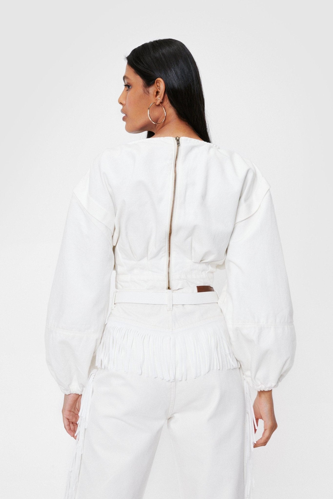 Wash are you up to? This top features a light wash denim and features a V-neckline, relaxed, cropped silhouette, elasticized hem, batwing, balloon long sleeves, seam detailing, zip closure at back, and ruffle detailing at shoulders. Model is 5'9" and wears a US size 6/UK size 10.