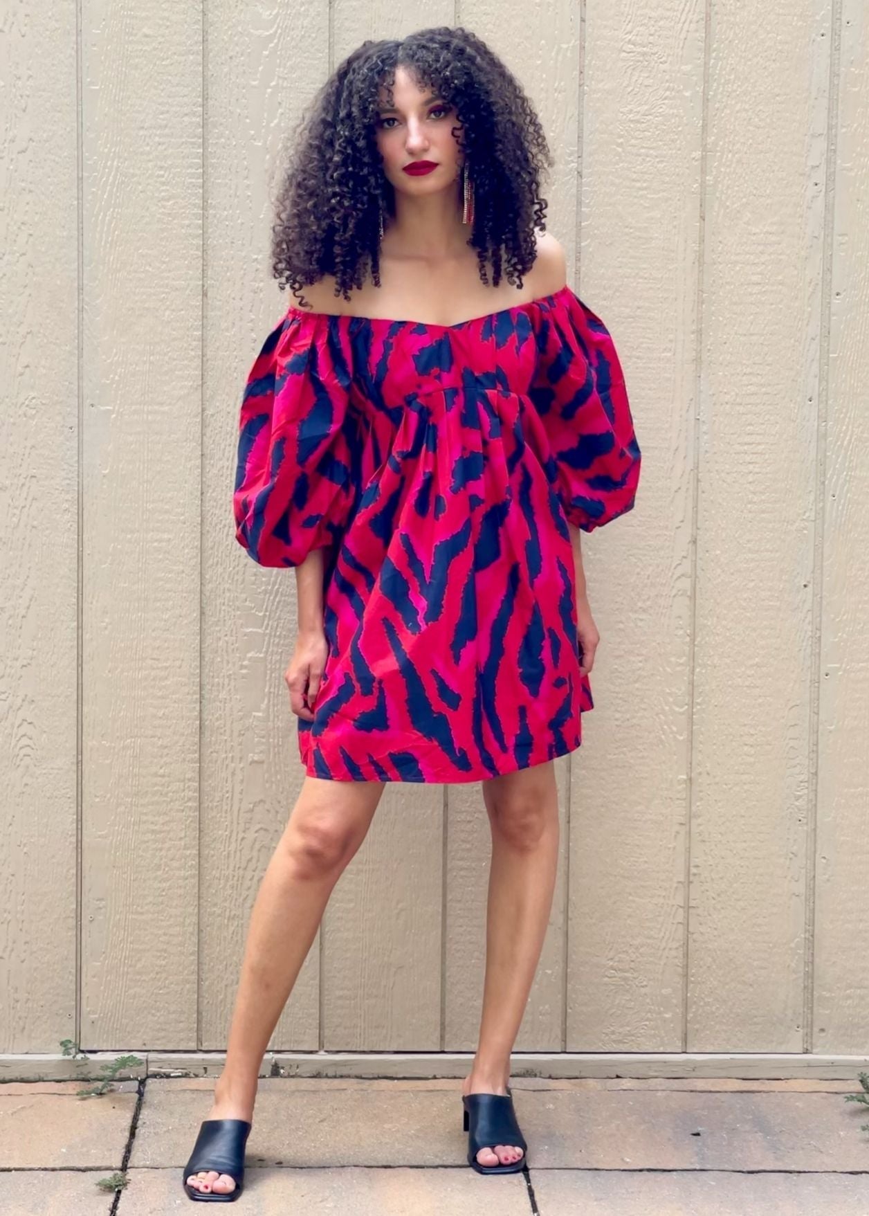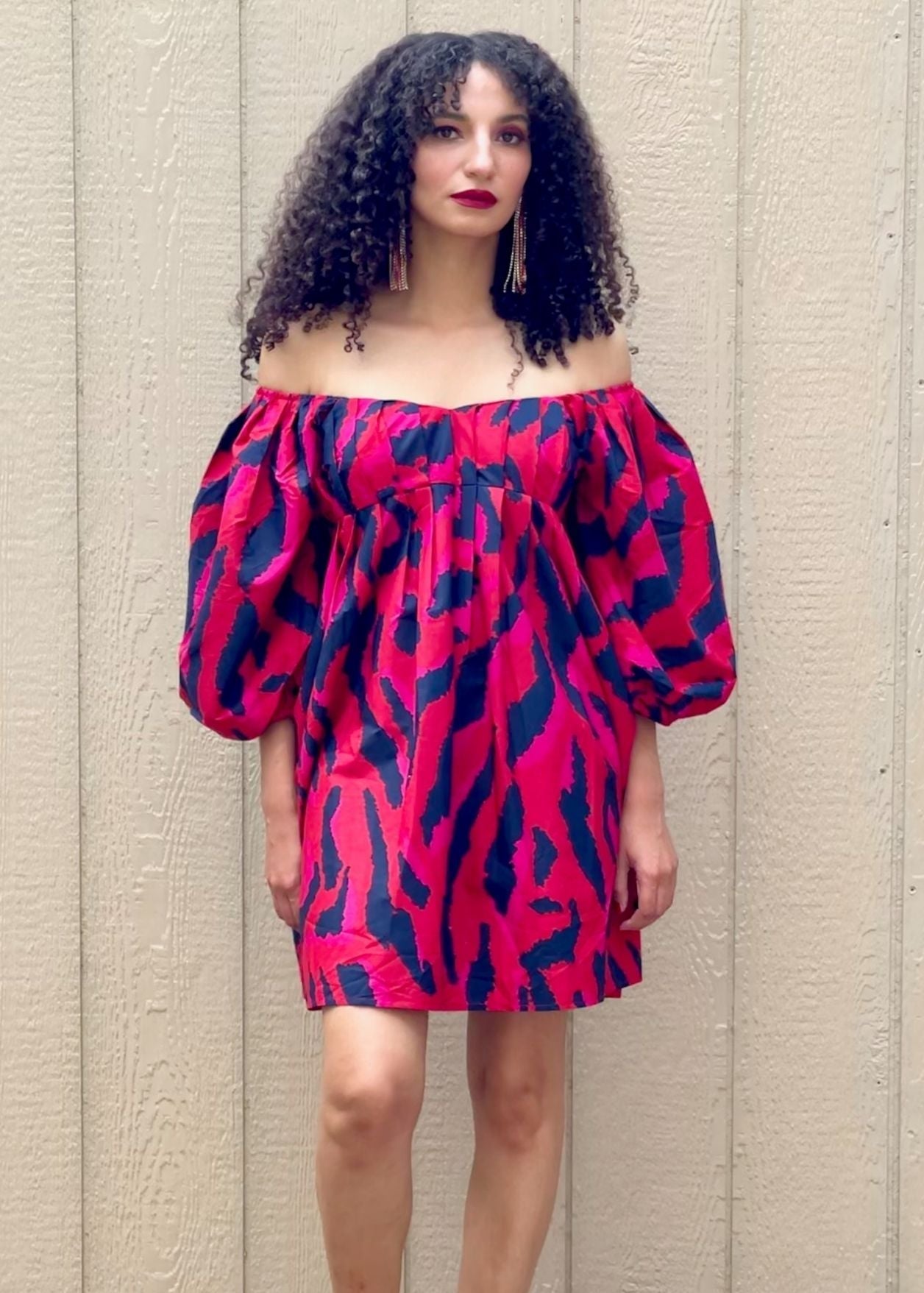 Rule the sidewalk. This dress features an off the shoulder, oversized, mini silhouette, oversized puff sleeves, sweetheart neckline, pleat detailing at bust, and abstract zebra print throughout. Model is 5'9' and wears a US size 6/UK size 10.
